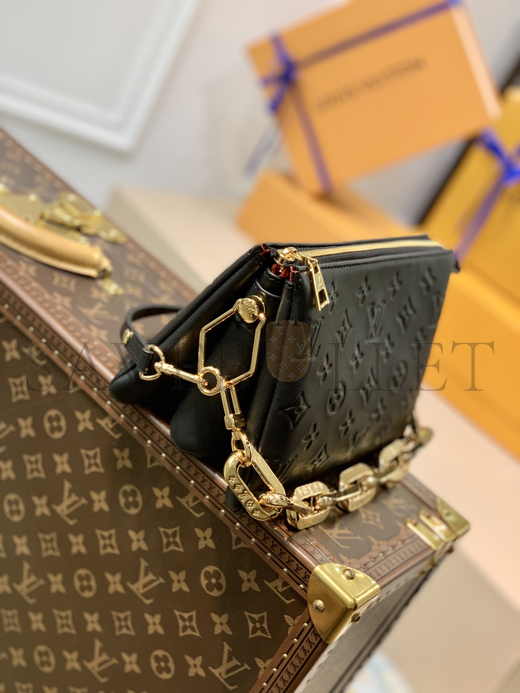 The super soft and cushiony Coussin BB is an adorably compact handbag, fashioned from puffy lambskin embossed with the Monogram pattern. A chunky gold-color chain and a thin leather strap, both removable, enable different attitudes and carry options. Two inside compartments add practicality, making this an ideal day-to-evening accessory.