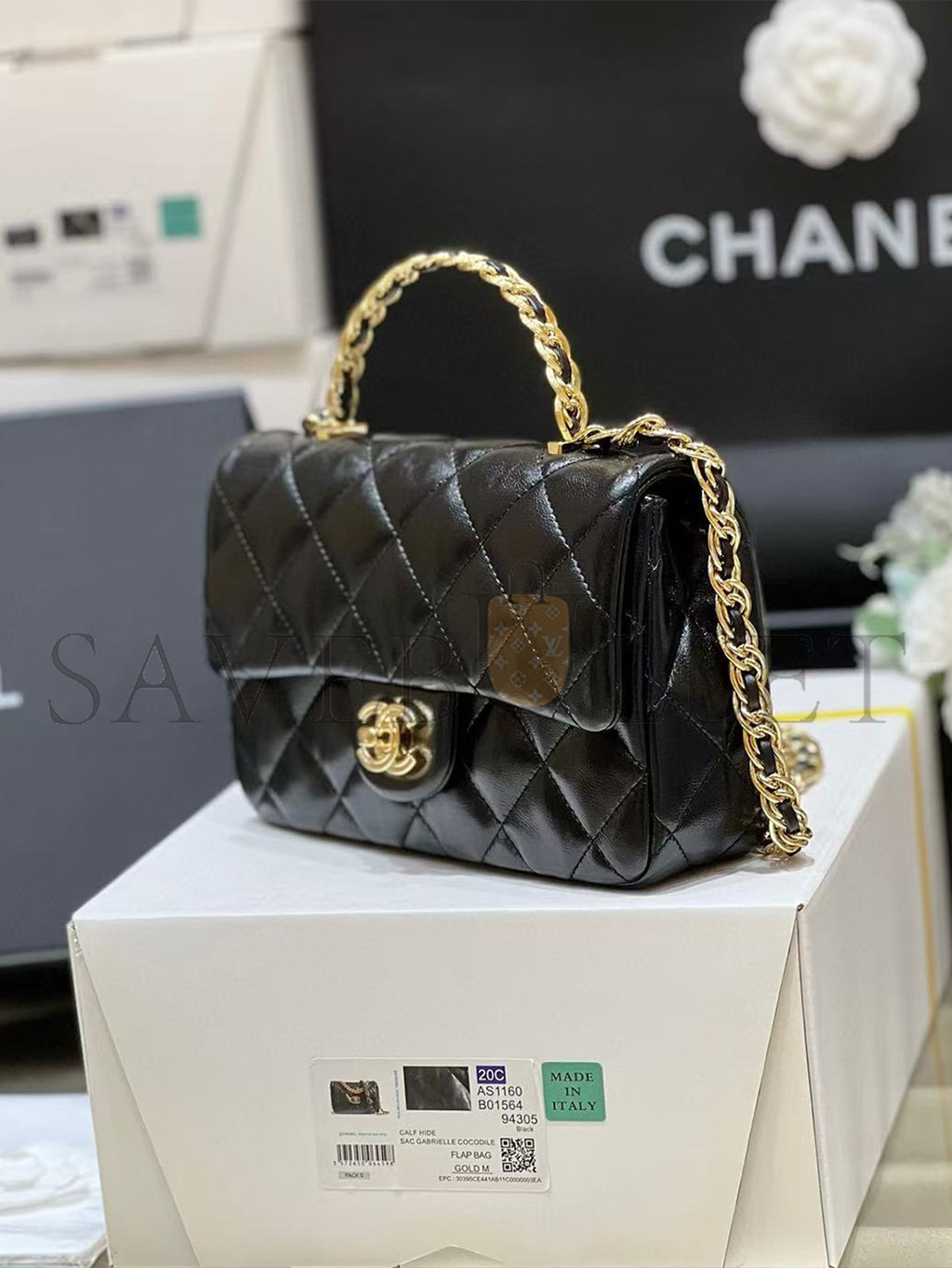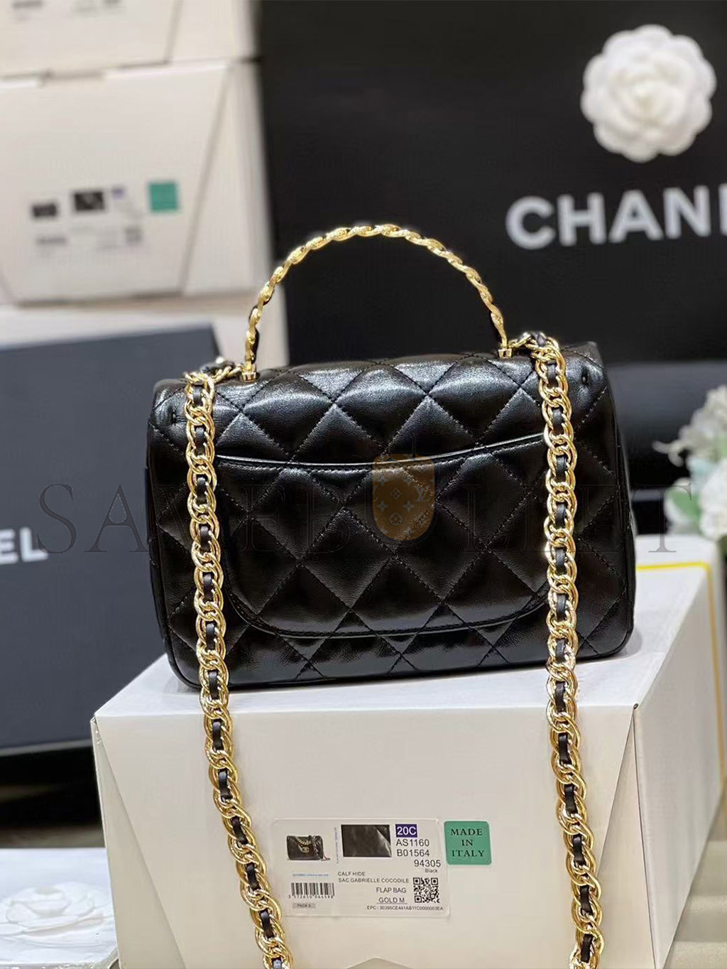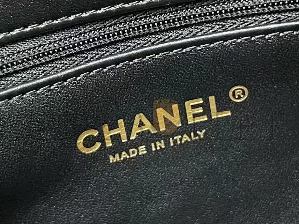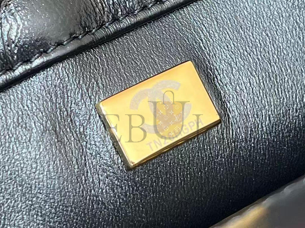 CHANEL SHINY LAMBSKIN QUILTED GOLDEN LINKS TOP HANDLE FLAP BLACK AS1160 (20*13*5cm)