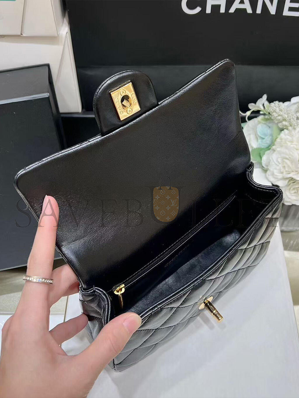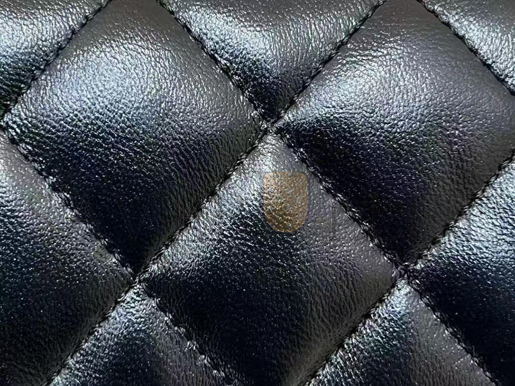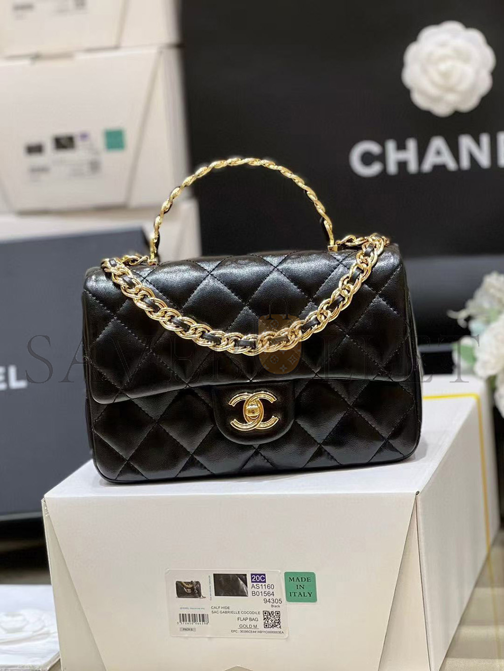 CHANEL SHINY LAMBSKIN QUILTED GOLDEN LINKS TOP HANDLE FLAP BLACK AS1160 (20*13*5cm)