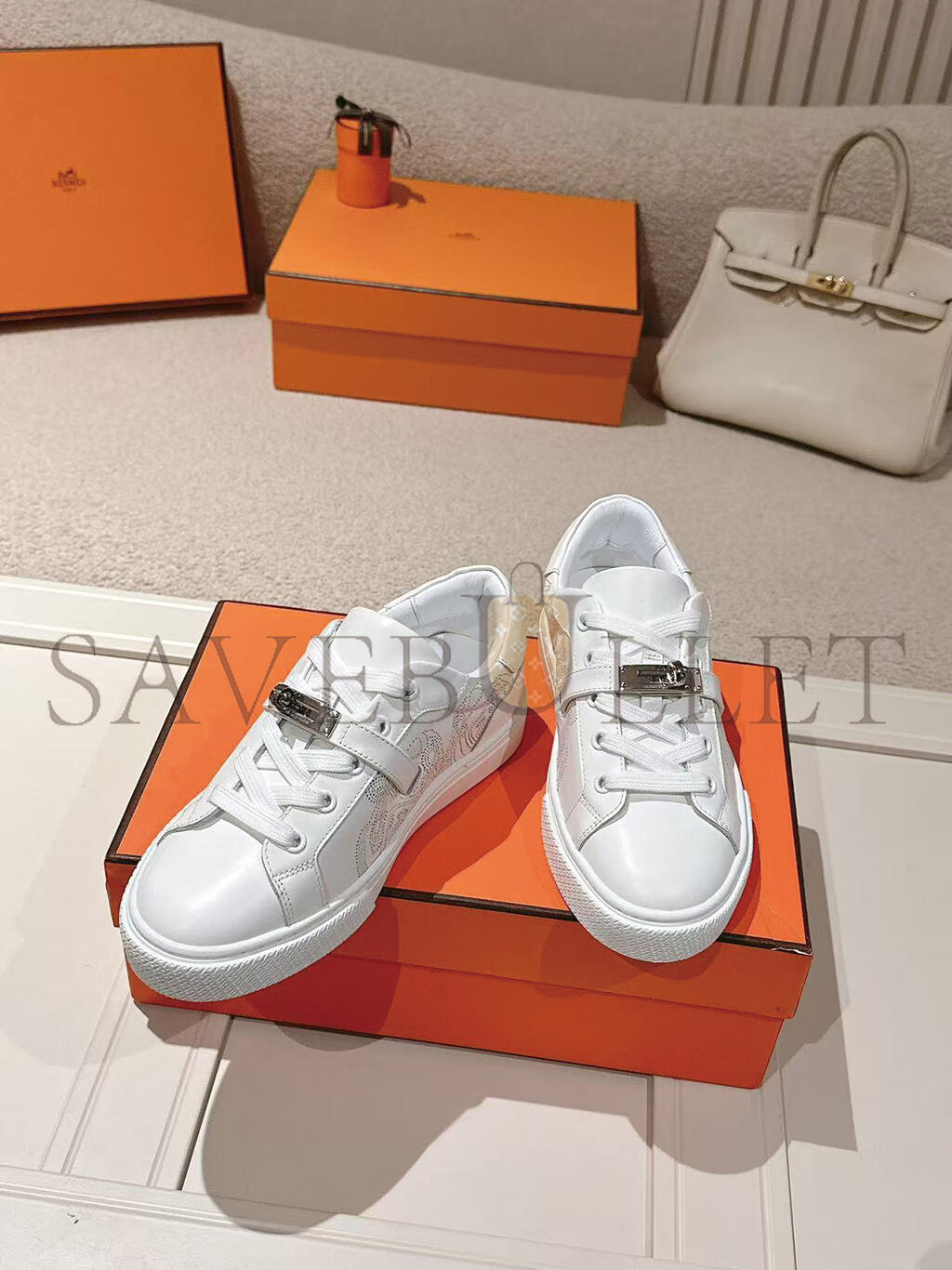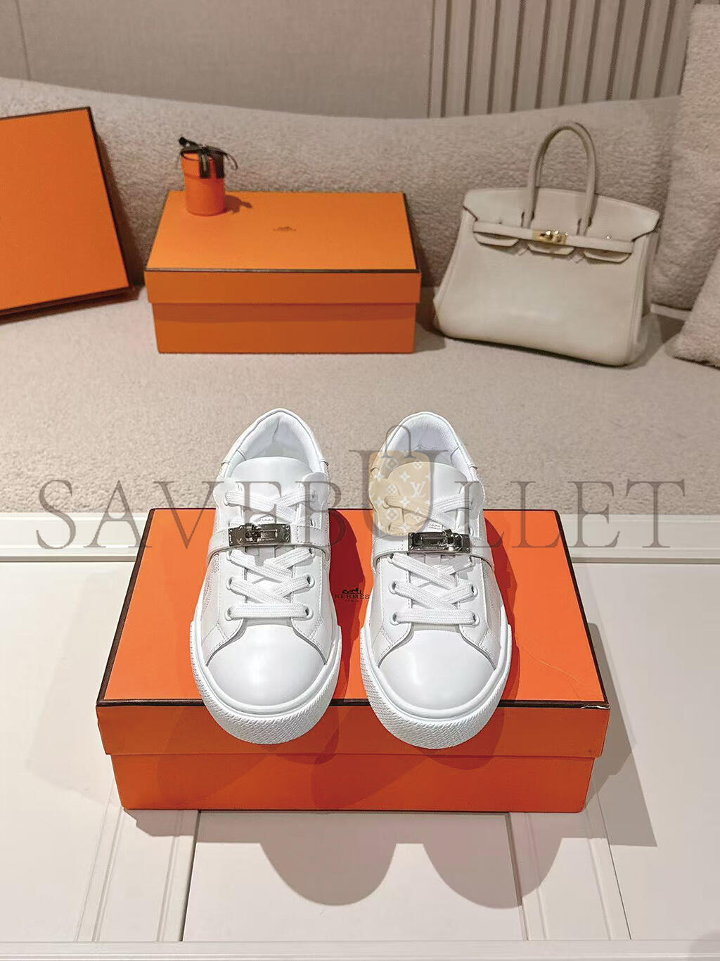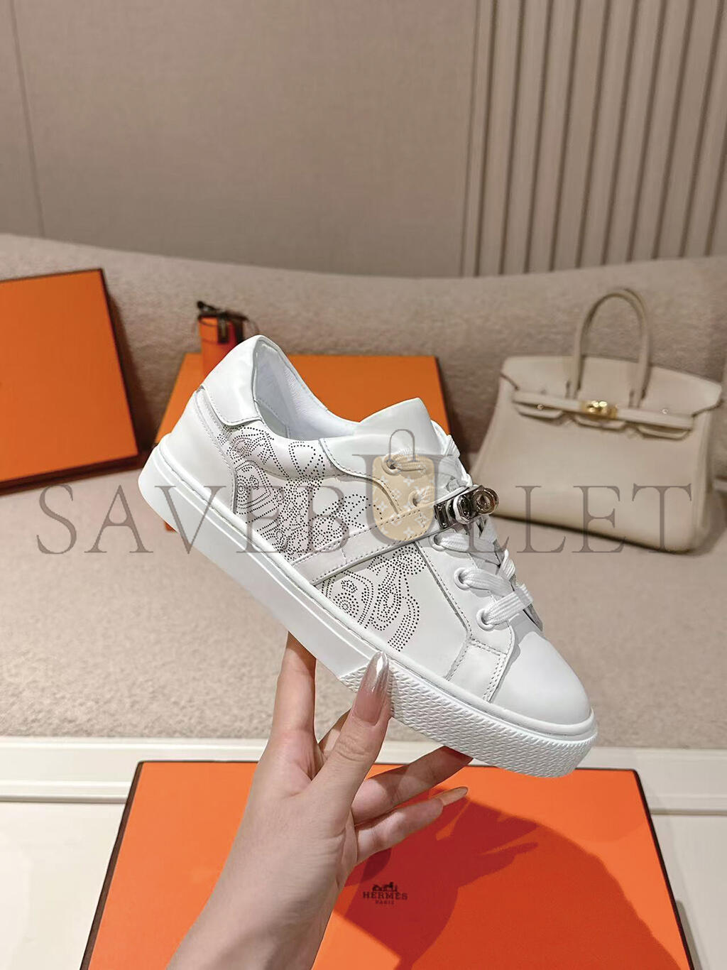 Sneaker in perforated calfskin with functional palladium-plated Kelly buckle.